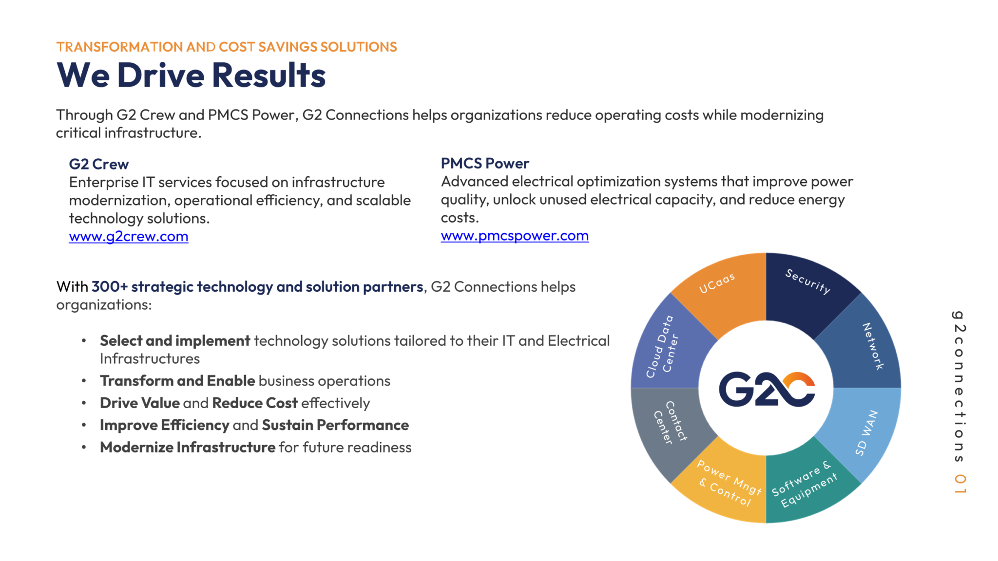 Organizations looking to modernize their infrastructure and optimize their energy consumption are invited to explore how these new services can drive immediate value. Contact G2 Connections today to schedule a discovery session and begin your technology transformation.